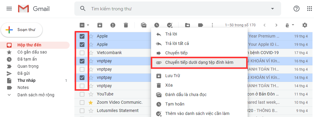 Chuyển tiếp nhiều email Gmail cùng lúc dưới dạng file đính kèm